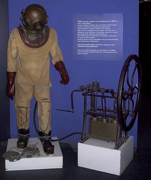 • 1838: Der nach England emigrierte deutsche Büchsenmacher August Siebe (Sachsen) entwickelt den Helmtauchanzug. Bis zur Entwicklung des „standard diving apparatus“ bestand die Gefahr, dass durch eine falsche Bewegung des Tauchers Wasser in den Helm eindrang und der Taucher im Helm ertrank. Der Anzug von Siebe wurde fest mit dem Helm verbunden, so dass ein Eindringen von Wasser verhindert wurde. Der Helmtaucher wird bis zur Erfindung des Lungenautomaten die wesentliche praktisch genutzte Technik bleiben.