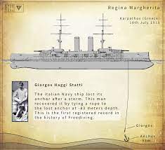 Im Juni 1913 verlor das Flaggschiff der italienischen Marine die „Regina Margherita“ bei einem Sturm vor Griechenland ihren Anker. Man versuchte vergeblich, den Anker aus 77 Metern Tiefe zu bergen.